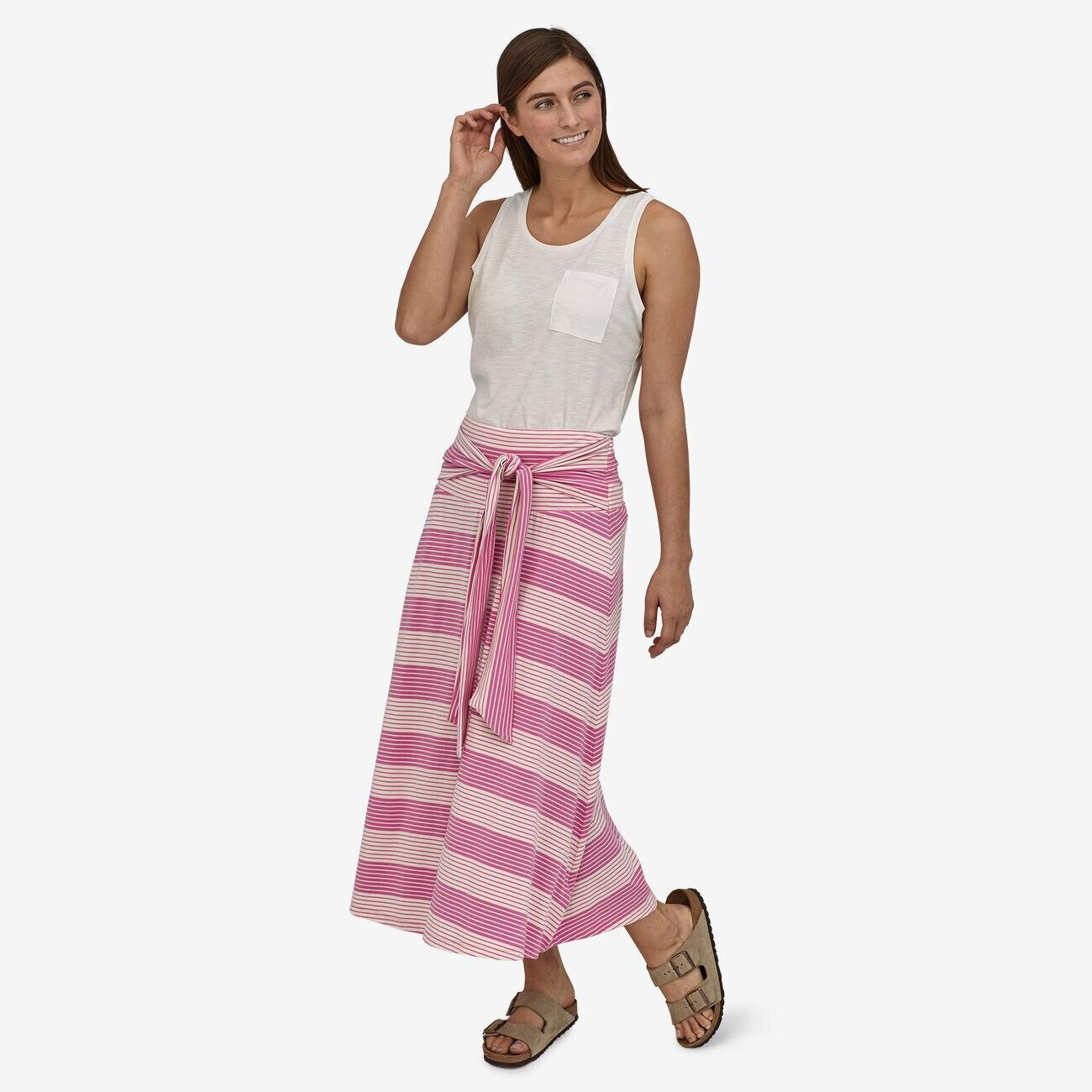 The Kamala Midi skirt is made by Patagonia—and they know what it takes to make a quality travel piece. The mid-length convertible piece boasts a straight hemline and can be adjusted into a halter dress. The Kamala is made from organic cotton and sustainably produced TENCEL® lyocell, and comes in stripes and florals, making this piece the conscious & stylish adventurer’s dream.